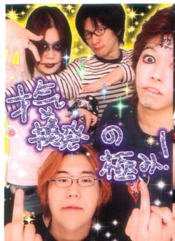 サイクロプスの四人にて(僕、バラキ、ラスト様、No.5)。今日は「真剣に解散を考えている。」のライブだったので、四人でプリクラを取ってみました。全員、頭脳にオーラを集中させてるので輝いてます。なお、辰巳君(暗井君)がいないのは仕様です。