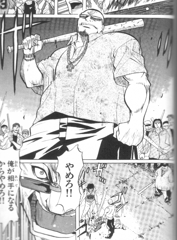 ブッ倒れた相手を金属バットや鉄パイプで殴り続ける(一人は他を牽制)。 主人公の基本戦術です。